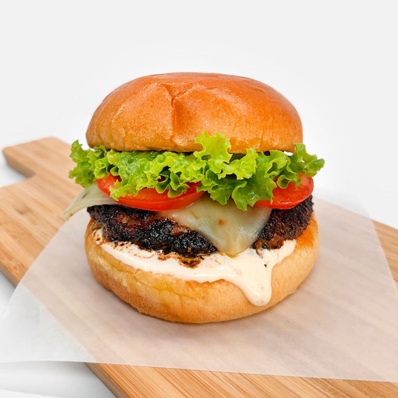 5 oz brisket & rib patty hit with our house spice blend, grilled with purpose. Pepper jack cheese, tomato, lettuce, and R66 sauce stacked on a toasted bun.