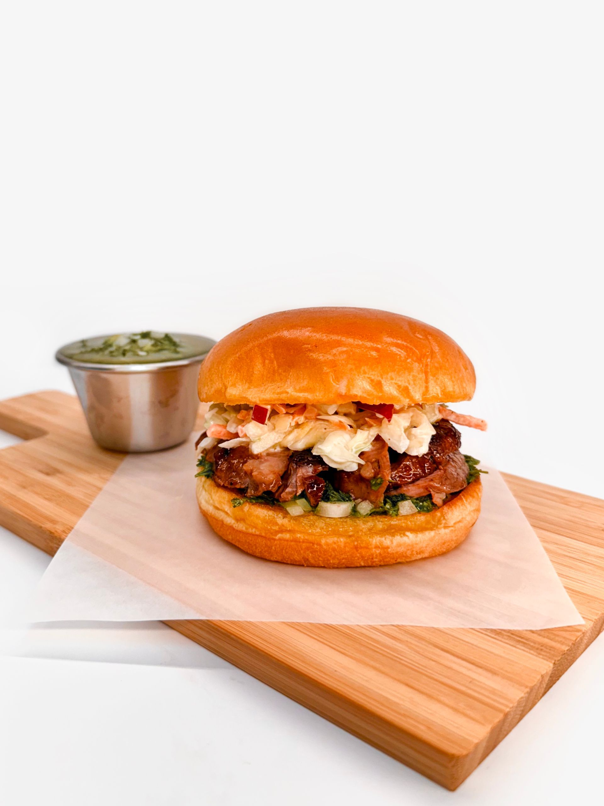 Juicy seared ribeye, chimichurri drip, and crunchy apple slaw stacked on toasted bun.