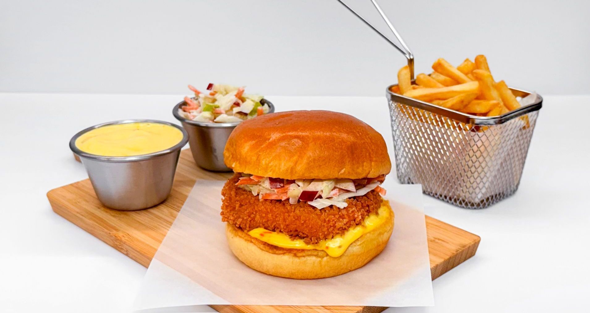 Fried saffron-marinated chicken stacked with creamy apple slaw and saffron aioli on a toasted bun.